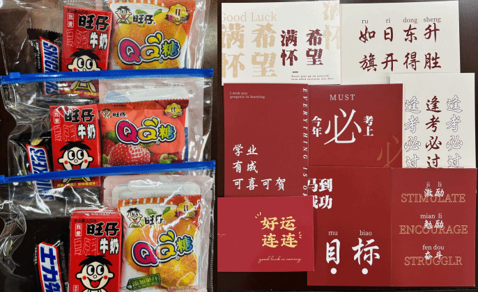 “逢考必过”“一举夺魁”“好运连连”的祝福卡片,一“旺”到底的旺仔牛奶......一份份暖心的礼物,一封封祝福的卡片,寄托了老师们的关爱,也传递了低年级同学对学长学姐们的祝福。