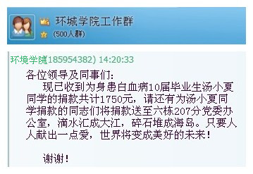 教职工、学生会、党支部及各个班级自发开展“为年轻生命铸就未来”捐款活动,爱心捐款活动在短短一个星期的时间内得到了全体师生员工的大力支持,大家纷纷为汤小夏同学伸出了爱的双手。截止2013年7月9日,此次爱心捐款活动为这个困难家庭共捐善款8000元。这8000元承载了环境工程澳门中特网
