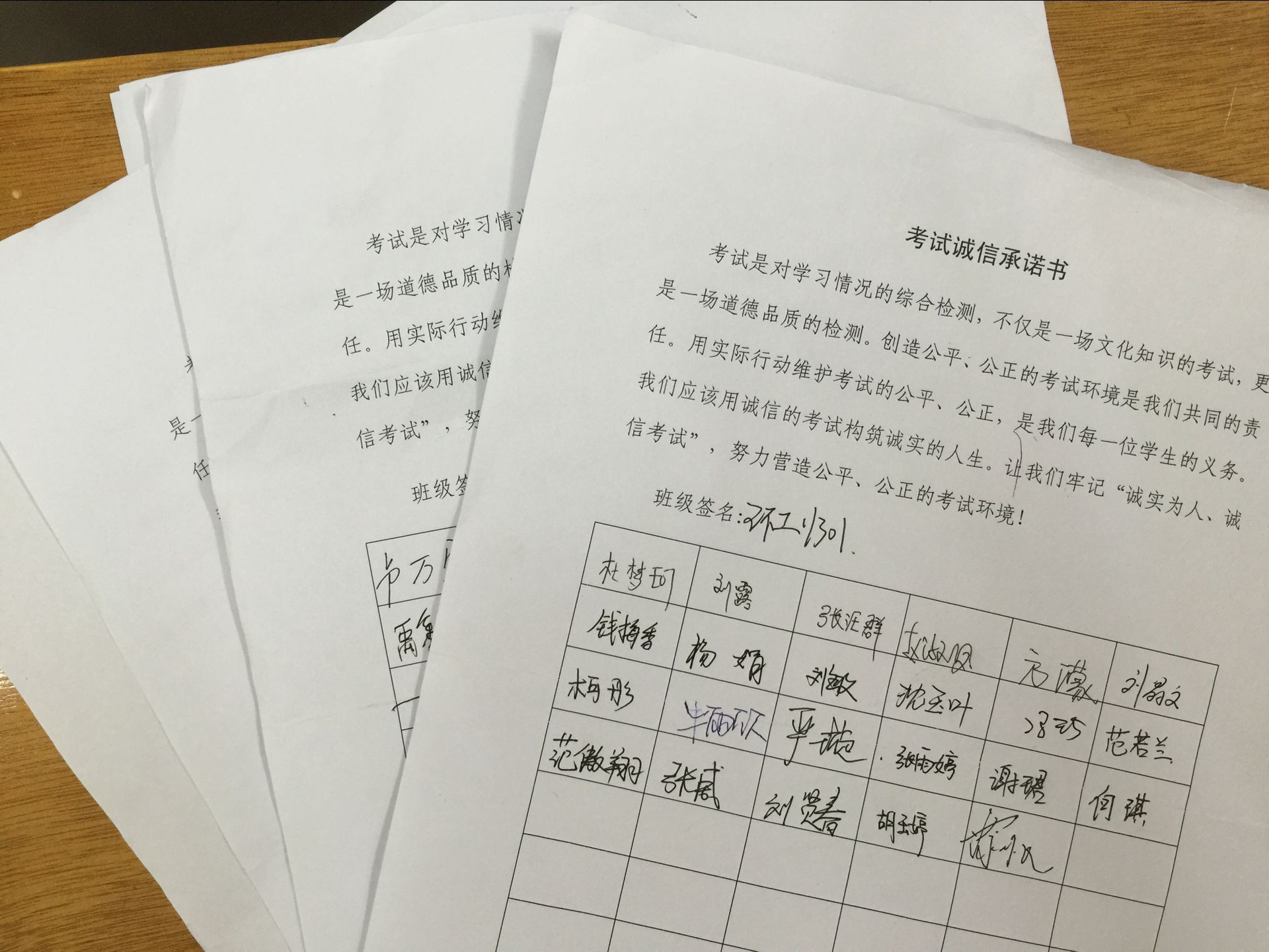 在班会结束后,班级同学针对即将开始的期末考试,签订了“诚信应考承诺书。”