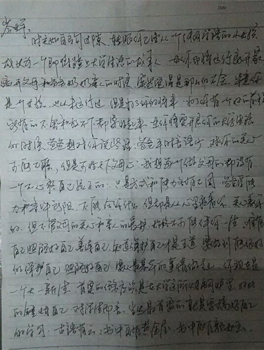新生入学教育内容之一,早在网上迎新时就布置给所有新生,并通过家长QQ群取得了家长的支持。家长们通过给新生写一份在外求学时父母的嘱咐和期望,希望在外求学的孩子能规划好大学生活,同时能在想家的时候、遇到困难的时候看到父母的信,感受到家长的关怀。旨在通过这样的方式,充分调动家长积极性,加强家校联系,既让学生感受家长的关爱,又让学生学会分享,学会感恩。