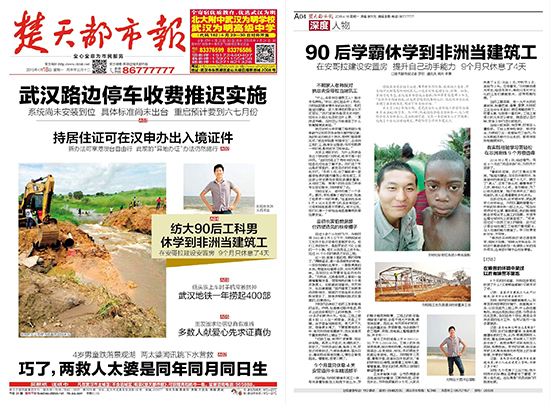 4月18日,《楚天都市报》以“90后学霸休学到非洲当建筑工”为题,头版深度报道了澳门中特网
