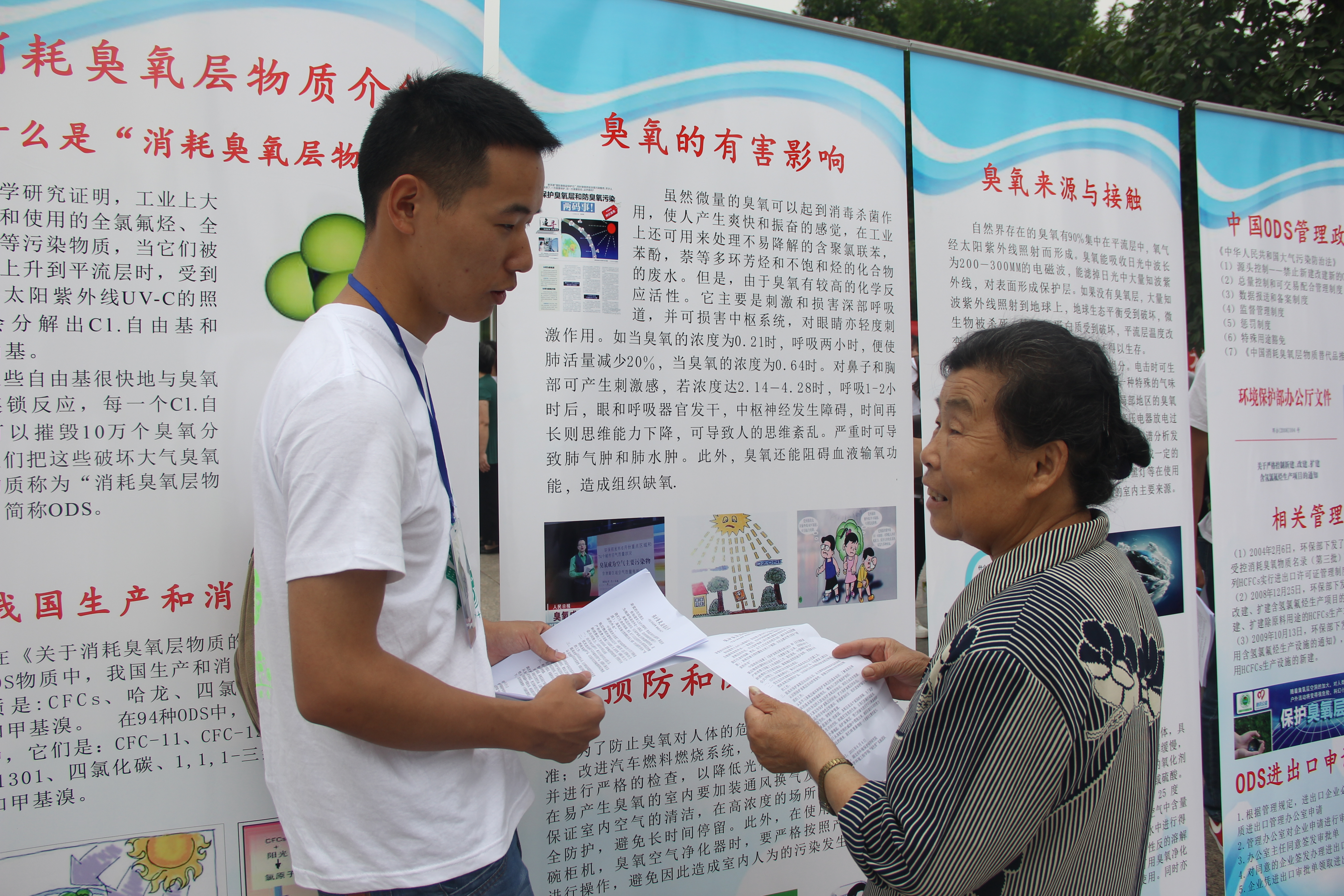 其中,环保话剧由大学生志愿者自导自演,化妆成皮肤癌“患者”的学生,套着用纸箱等工具制作的冰箱模型,用话剧的形式生动展现了氟代烃等人工排放的化学物质对臭氧层破坏将产生的后果;最为夺人眼球的就是“环保行为艺术”,大学生通过“快闪行为艺术”的方式展现了“臭氧层正在遭到破坏,地球母亲正在呼唤的”内容,以此呼吁人们能减少含氟代烃等化学物质的使用;当广场上闪现大学生用身体摆出的“SOS”等造型时,引来观看的市民阵阵欢呼,他们纷纷表示,自己要加入臭氧保护行动中来,多使用环保产品,为保护地球母亲贡献自己的一份力量。