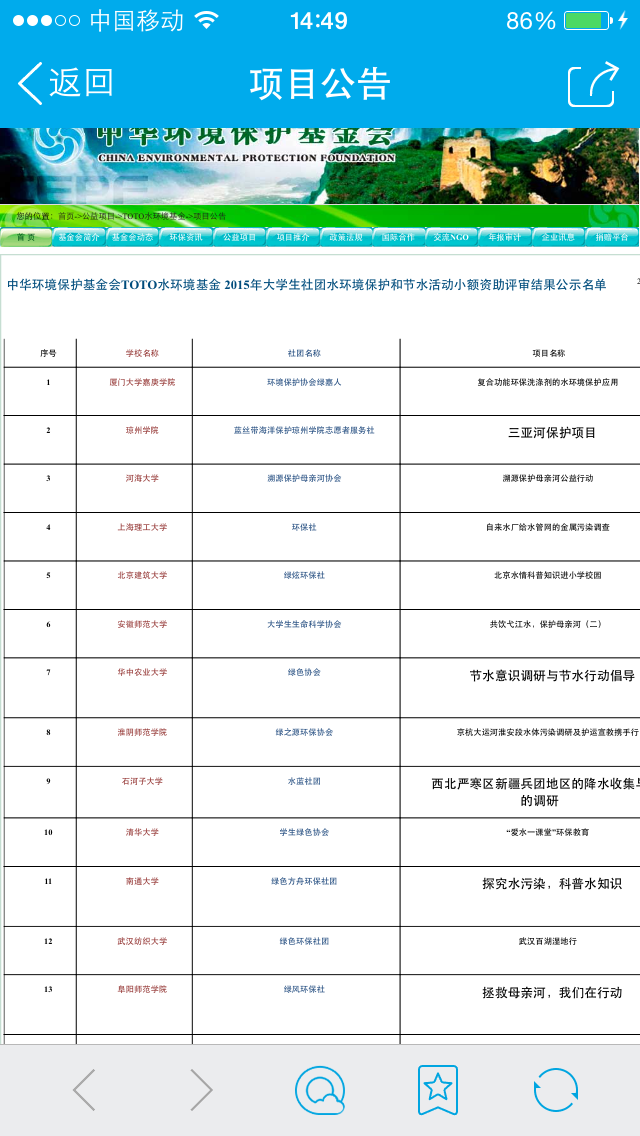 2015年9月22日,从中华环境保护基金会传来喜讯,绿色环保协会成功中标2015年TOTO水环境保护和节水项目,成为此次竞标成功的全国30家大学生环保社团中的一支。