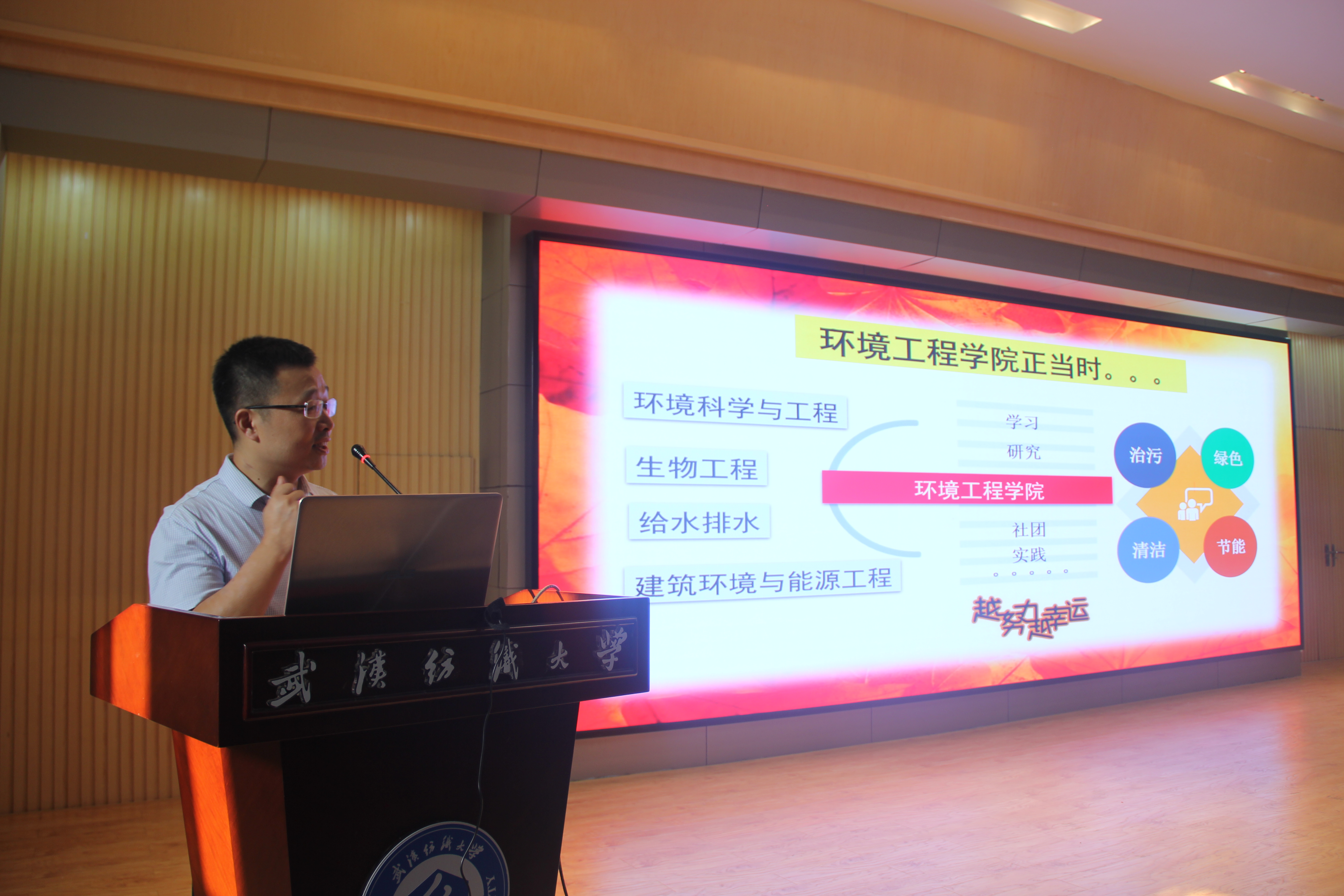 典礼上,院长夏东升教授借此机会,与在座人员分享了环保“微讲座”。他以《以实现绿水青山为已任做一个合格的时代践行者》为题,通过对传统文化的科学基因、当代中国竞争力与骄傲、能源与环境污染问题及生态文明建设国家战略等的全面介绍,引出谁来担当生态文明建设使命的命题。他勉励同学们,要充分利用学校提供的优良学习条件,学好本领,做一个生态中国的践行者,为建设美丽中国贡献力量。