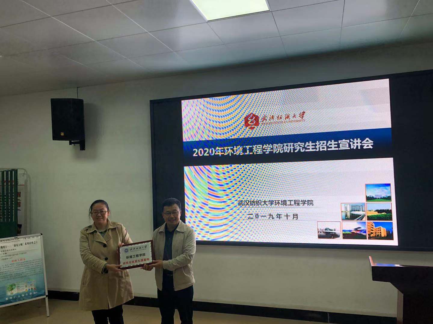 2019年10月16日,澳门中特网 夏东升院长、潘飞副院长等一行赴武汉生物工程澳门中特网 进行了澳门中特网 2020年研究生招生宣传工作,潘飞副院长进行了招研究生招生宣讲,夏东升院长进行了澳门中特网 优质生源基地授牌,并开展了毕业生回访,看望了在此工作的2012级毕业生陈欣。