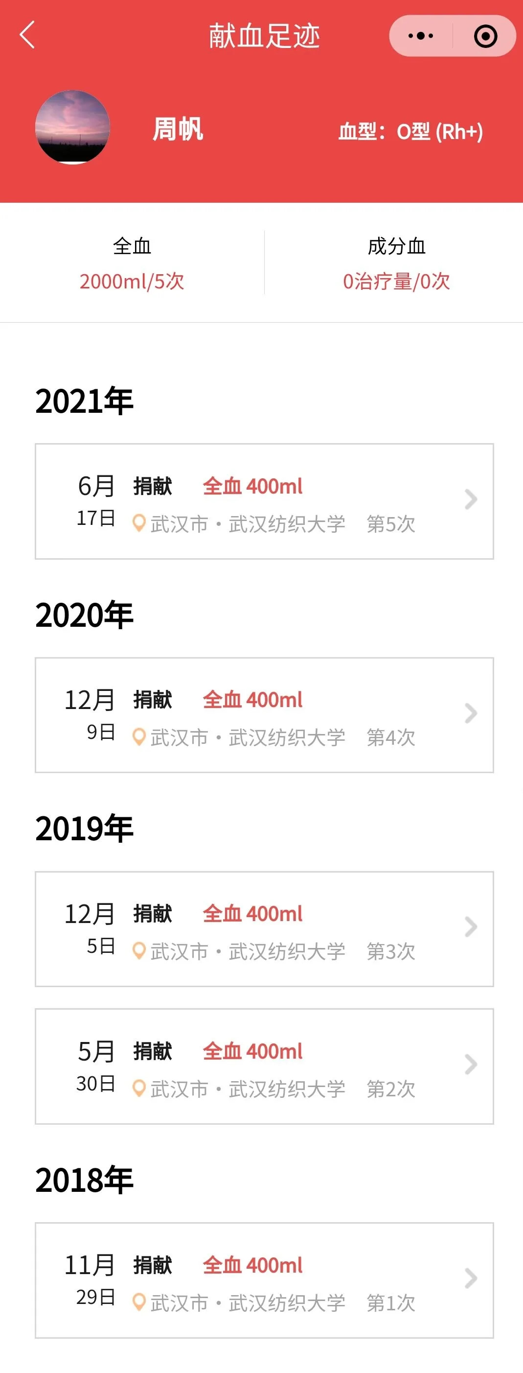 2021年初,家乡社区疫情防控需要人手,周帆协助社区开展防疫宣传,一干就是15天,每天走遍12个村社的角角落落,一路上虽然寒风凛冽,但心却是火热的。“能为社会贡献力量是我的荣幸”,周帆是这样说的,也是这样做的,大学期间,他每个学期献血一次400ml,至今已达2400ml。周帆表示,“我的血液能为别人化险为夷、带去希望,十分值得”。