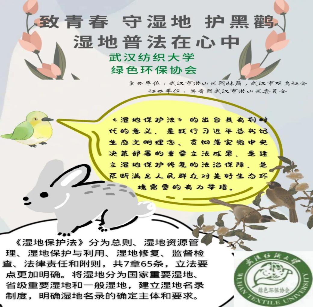 护鸟净滩巡湖,科普“湿地科技与湿地经济”。志愿队员长期开展生物多样性保护与调研,在天兴洲武汉珍稀物种保护宣传中心、国际重要湿地沉湖,开展科普黑鹳、中华秋沙鸭等国家一级保护动物迁徙、鱼类洄游的调研、科普活动,通过监测鸟类、清理沙滩等形式协助修复湿地环境,引导更多的群众关注湿地保护和生物多样性保护。