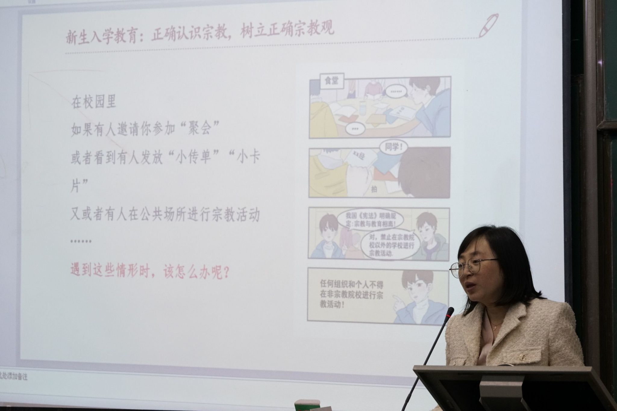 给2023级新生班主任代表发放聘书,她表示班主任是思政教育中非常重要的一支队伍,更是新生们的引路人,希望老师们在工作中能相互配合,发挥好朋辈导师的作用,引导学生热爱专业、潜心向学,快速适应大学学习生活。