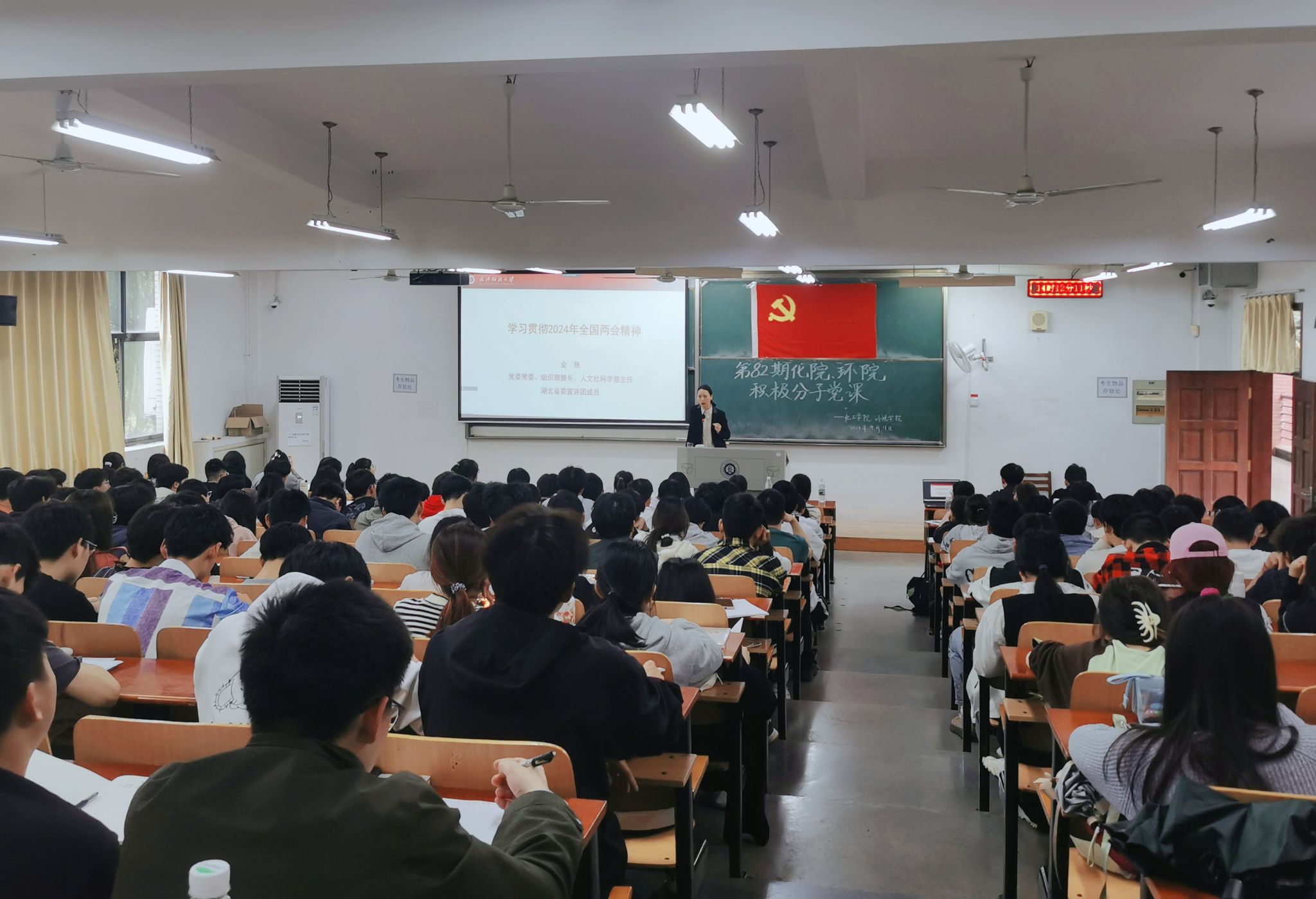 金艳以《学习贯彻2024年全国两会精神》为题,她采取“问题式”的方法切入主题,详细介绍两会的历史背景及其意义,并带领学员们学习习近平总书记三次“下团组”的重要讲话及重要指示精神。同时结合经济形势、学校发展情况、学生关心的时政问题,围绕“如何发展新质生产力”、“坚持以人民为中心的发展思想”、“坚持稳中求进工作总基调”、“坚持正确的思想方法和工作方法”、“弘扬教育家精神、科学家精神、优秀企业家精神,发扬自我革命精神”五个方面,对2024年“两会”精神进行了深入浅出的解读。