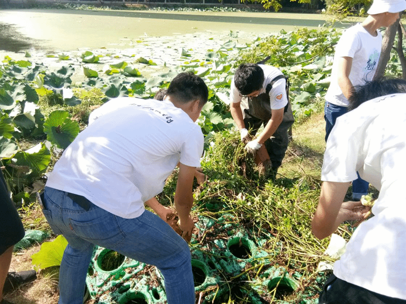 湖北大学沙湖环保志愿队将美人蕉、空心菜、水芹等植物移植到浮体上栽培,降低水体富营养化程度。