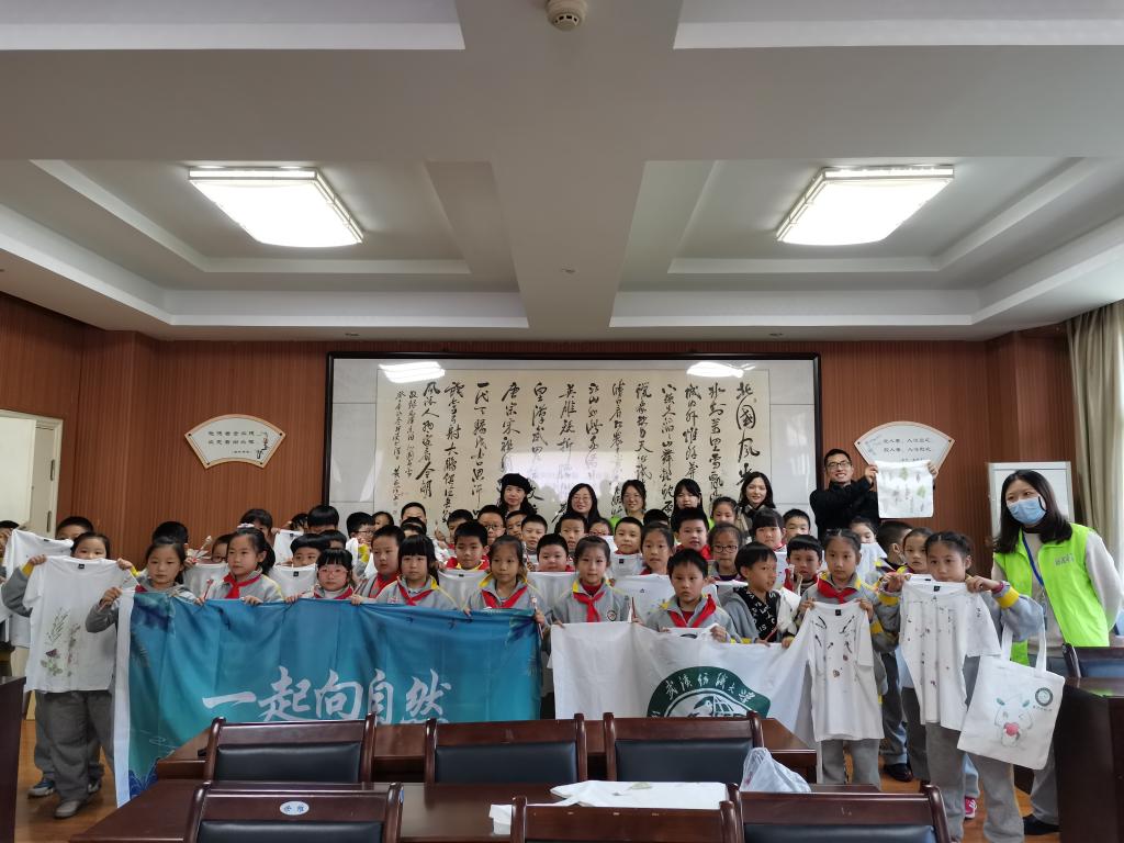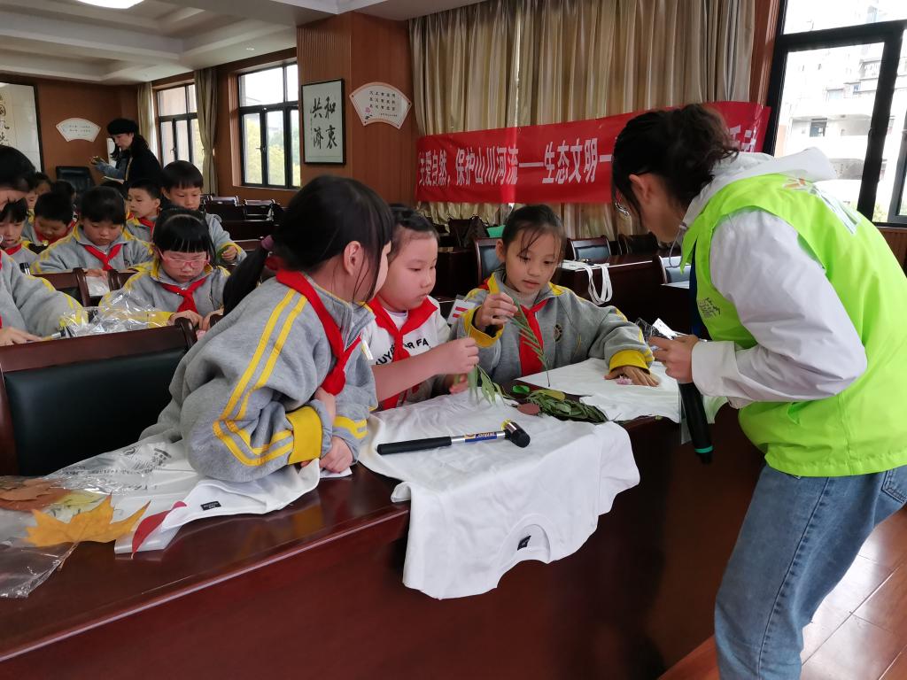 知识源于实践,绿色生活理念的树立更需要实践。整个课程最后,同学们在志愿者的指导下,开展植物拓染活动,将美丽的花朵、树叶印在衣服上、布袋上。北湖小学教导主任盖楠介绍,日常学习中学校也会开展各种自然教育活动,还经常组织环保、园林等领域专家到校授课,或组织学生到校外基地开展“自然笔记”等环保实践活动。