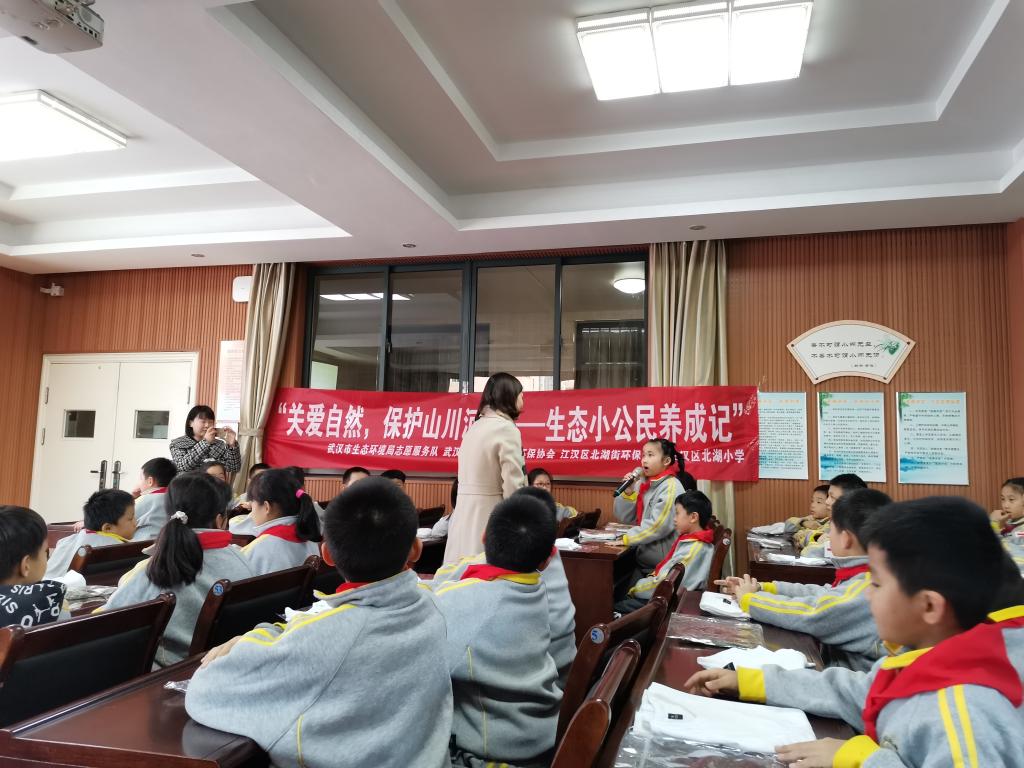 据悉,本次活动是武汉市生态环境局举办的“关爱自然,保护山川河流——生态文明一路同行”系列公益活动之一。当天,来自武汉生态环境局志愿服务队、武汉纺织大学绿色环保协会的志愿者们走进北湖小学,通过多种形式的课堂活动,给孩子们讲解生态环保知识、传递生态环保理念。
