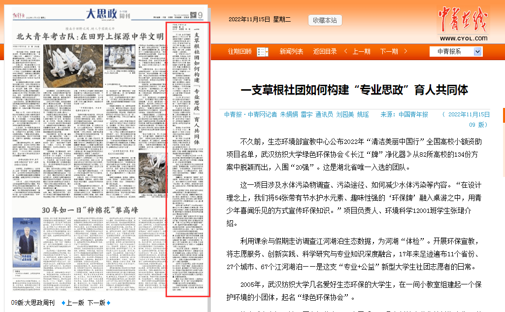 不久前,生态环境部宣教中心公布2022年“清洁美丽中国行”全国高校小额资助项目名单,武汉纺织大学绿色环保协会《长江“牌”净化器》从82所高校的134份方案中脱颖而出,入围“20强”。这是湖北省唯一入选的团队。