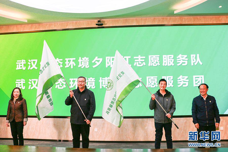 图为武汉生态环境夕阳红志愿服务队、武汉生态环境博士志愿服务团授旗仪式现场。新华网发 陈云 摄