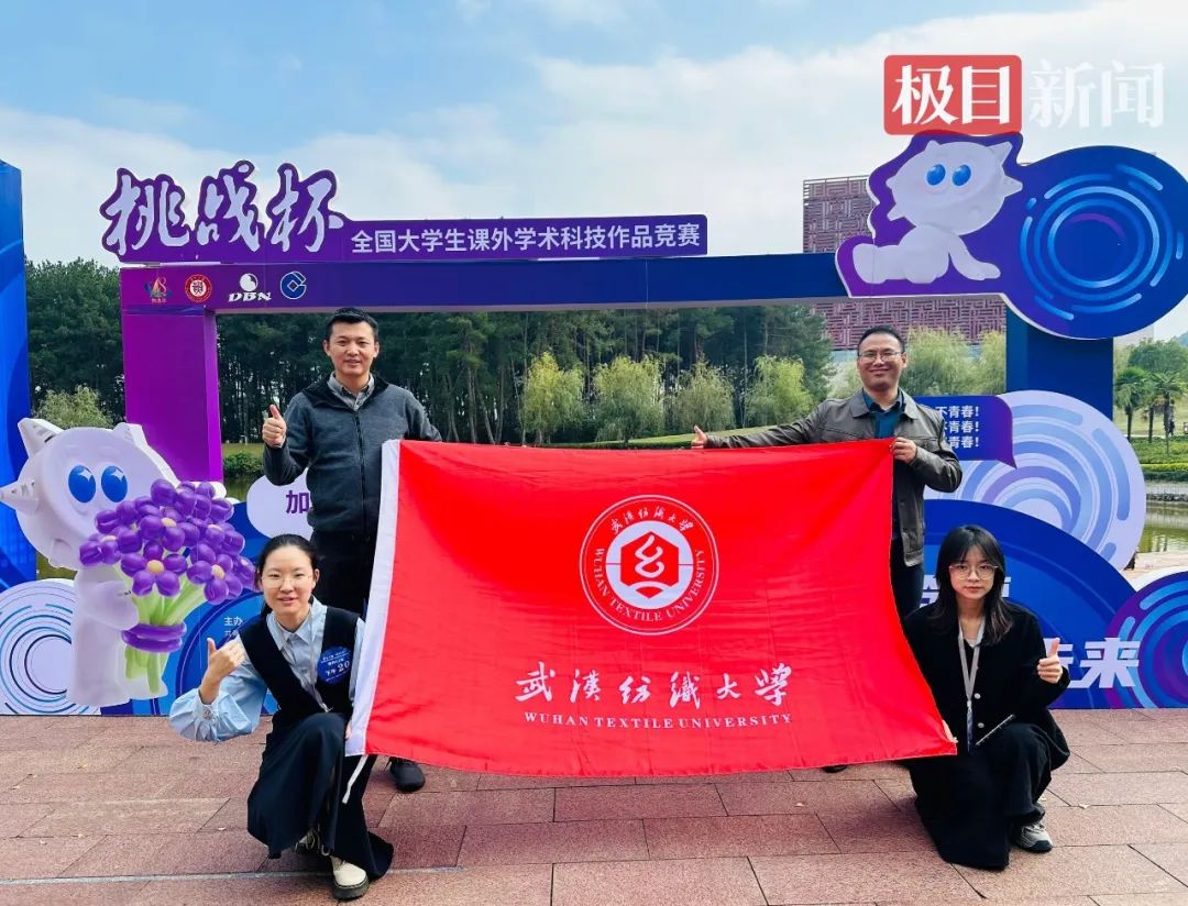 武汉纺织大学本科生丁艺琛和指导老师李东亚、关泽宇的«可聚可降催化界面加速驱动的新型碳回收—水处理技术»,在第十八届“挑战杯”全国大学生课外学术科技作品竞赛主体赛中,获得了全国特等奖。
