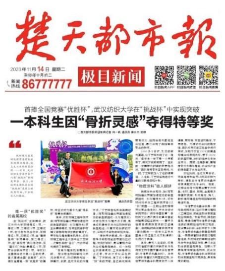 在“挑战杯”主体赛中,武汉纺织大学获特等奖1项,一等奖2项,二等奖2项,三等奖1项;在红色专项活动中,获特等奖1项、三等奖1项;在“揭榜挂帅”专项赛中,获二等奖1项;在“黑科技”展示活动中,获“星系级”作品(最高奖)1项;获累计创新专项奖1项。学校以全国团体总分第31名的成绩,首次捧得全国“优胜杯”,成为湖北省属唯一获“优胜杯”的高校,并正式成为第十九届“挑战杯”竞赛发起高校。
