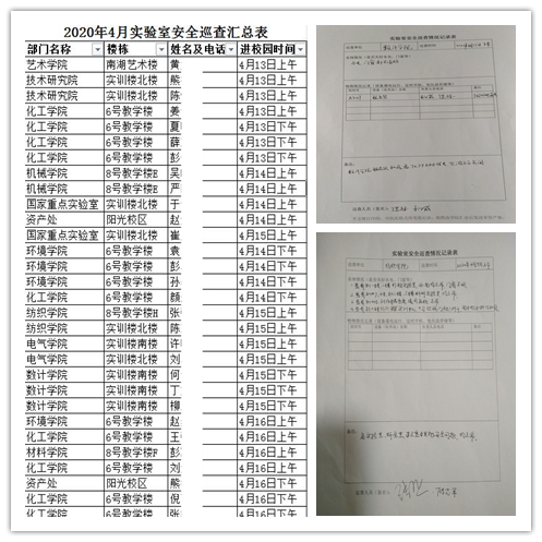 等11个单位进行了安全隐患现场巡查,巡查人员在做好自身防护、不聚集的情况下,深入安全重点防范部位和实验室认真检查了室内外水、电、气、仪器状态、危险化学品存放等情况,对部分精密仪器设备进行了维护和检测,对安全隐患进行了及时处理,并做了详细记录,防止发生因疫情期间无人值守造成的实验室安全事故,也确保各类仪器设备在正式复学后能正常运行。