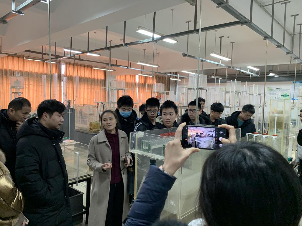 在大型水处理实验室和水污染控制实验室,施银桃老师给同学们介绍了水厂、污水厂的工艺流程,以及水厂的混凝、沉淀池、污水厂曝气池等水处理构筑物,形象生动地展示了污水处理的整个过程,深深的触动了同学们节水、护水的神经。施老师以澳门中特网