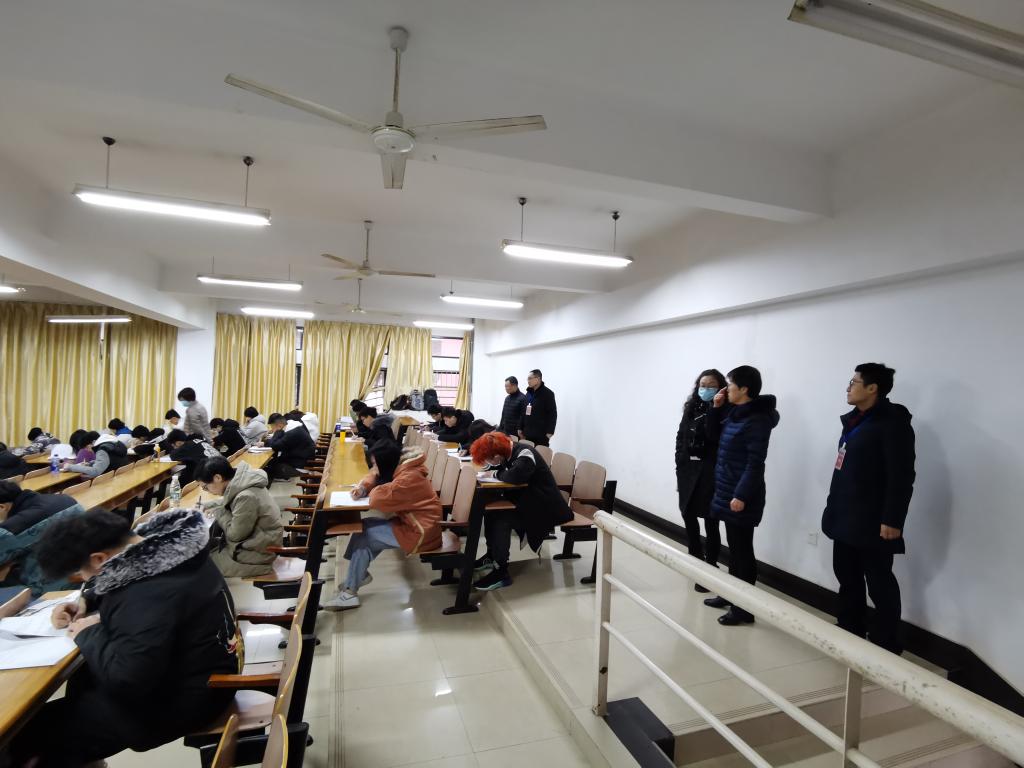 12月14日,院长夏东升、党委书记谢晓萍、教学副院长潘飞、办公室主任吴云,深入考场检查巡视期末考试情况。