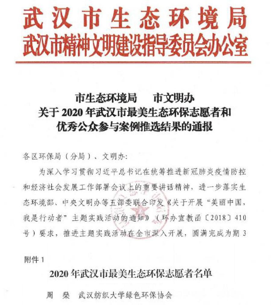 近日,武汉市生态环境局及市文明办公布了2020年武汉市最美生态环保志愿者和优秀公众参与案例推选结果,我校绿色环保协会周燊顺利入选最美生态环保志愿者。