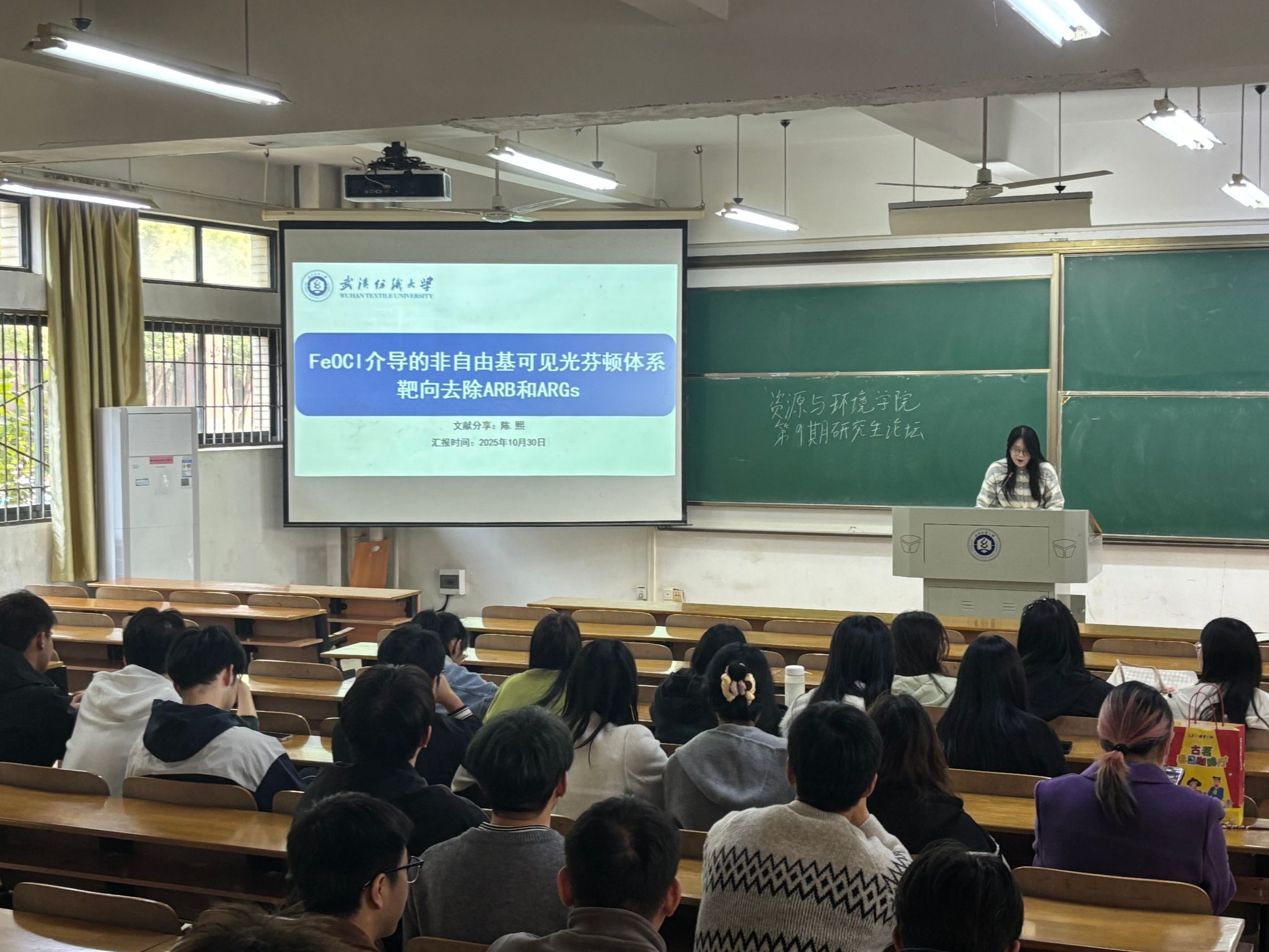 陈熙同学分享了FeOCl介导的非自由基可见光芬顿体系靶向去除ARB和ARGs,该研究构建了FeOCl介导的非自由基可见光芬顿体系,利用¹O2和h+协同高效去除抗生素耐药菌(ARB)与耐药基因(ARGs)。体系克服了传统自由基路径的局限,阐明了微生物不可逆损伤及基因传播阻断机制,为水体耐药性污染提供了新策略。