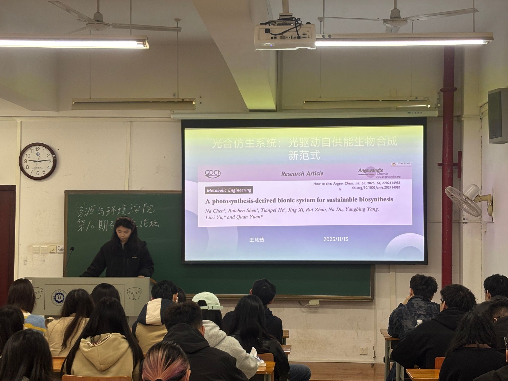 王慧茹同学探讨了该研究受自然光合作用启发,设计了由光诱导电子模块、电子转移通道模块和质子梯度模块组成的光驱动仿生系统。其核心是通过缺陷调控和能带结构工程等策略,实现NADPH和ATP的同步可控供应,解决微生物代谢中二者不足的问题。实验表明,该系统能显著提升沼泽红假单胞菌的CO2固定效率和番茄红素生物合成效率,电子转移效率高达90.8%,光子转化效率提升1.6倍。该系统还适用于大肠杆菌等菌株,为可持续生物制造、CO2减排提供了新路径。