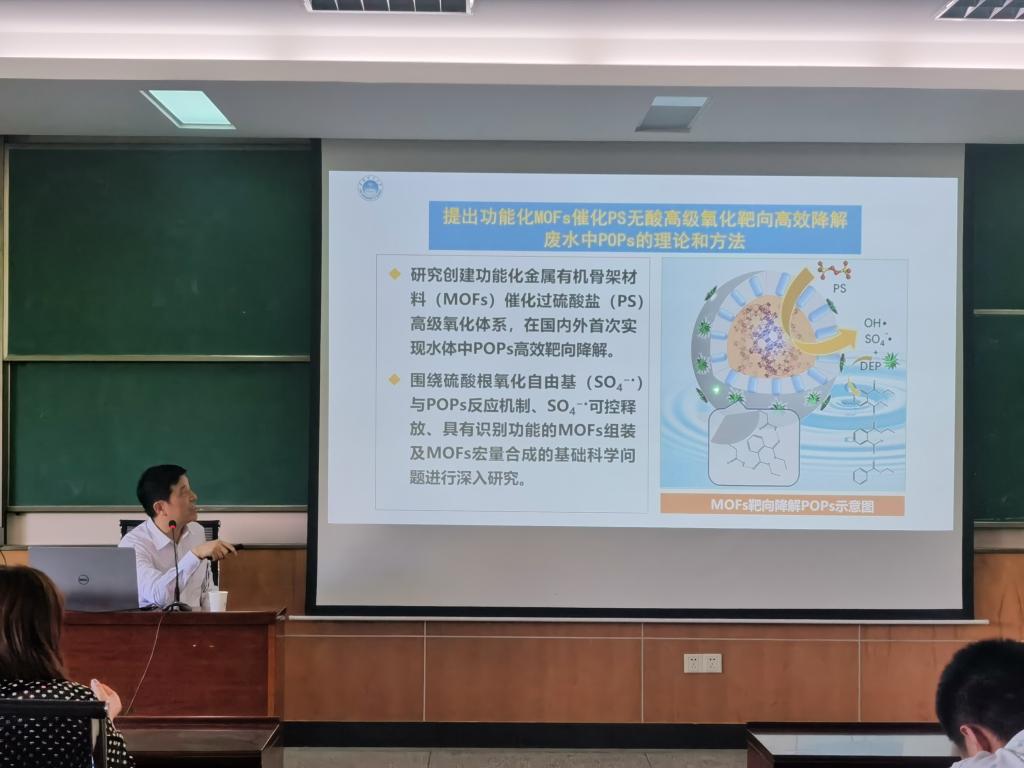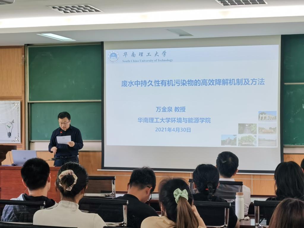 对万金泉教授的到来表示热烈的欢迎,并简要介绍了其研究方向和科研成果。万金泉教授以“废水中持久性有机污染物的高效降解机制及方法”为题目,报告了废水中持久性有机污染物(POPs)对水处理及生态环境的影响现状,围绕采用过硫酸盐(PS)无酸高级氧化技术深度降解POPs的基础科学问题,从硫酸根氧化自由基(SO4−•)与废水中POPs的降解关系、SO4−•的可控释放、具有靶向识别功能MOFs催化剂的组装及MOFs宏量合成四个方面进行深入探讨。报告对于加深人们对废水中POPs的深度消除的科学认识具有重要意义。该报告深入浅出、精彩纷呈,参与的相关教师和学生开展了热烈的讨论,为师生提供了一次难得的学习和交流机会,有助于师生进一步了解废水处理领域的前沿动态,开拓学术视野。