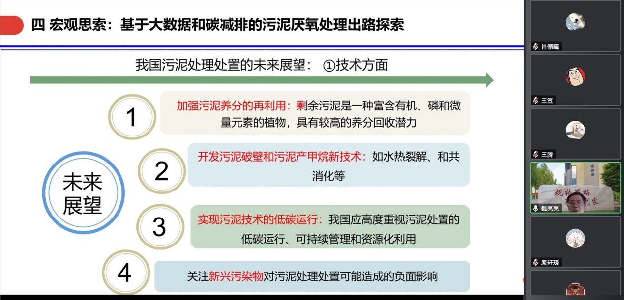 魏亮亮教授在基于城镇污水处理处置及资源能源回收利用的研究背景下分析了在微观上胞外聚合物的物化特征、降解特性及环境行为。结合污泥EPS聚合结构、表面电荷特征、元素组成分析了其对环境产生的影响;同时探索了厌氧消化过程中胞外聚合物的降解特性,探索了在多介质非均相复杂体系下制备生物燃气强化传质以及运用生物炭强化厌氧消化产甲烷的效能及机制;最后在宏观层面上提出了基于大数据和碳减排分析,探索污泥厌氧处理的出路。