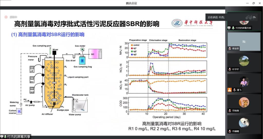付杰教授首先从新冠肺炎疫情出发,强调加强杀菌消毒的必要性,并分析了高剂量消毒过程加速抗生素耐药性传播的途径。在谈到消毒过程对污水厂生物处理的影响时,他从污水处理厂的调研结果和高剂量氯消毒过程两方面展开,深入探究氯消毒对反应器运行效能、细菌群落分化、宏基因组的变化、氯抗性基因、抗氯机制等多方面的影响。此外,付杰教授还结合前期的研究,分享了未来即将开展的研究规划以及开展调研课题、政府提案、社情民意的情况。报告结束后,参会师生针对讲座内容进行踊跃提问,付杰教授对这些问题进行了细致解答。