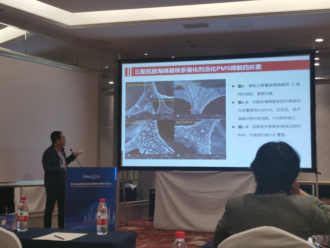 4月15日下午,潘飞教授在“水处理材料与药剂”分会场做了题为“纺织纤维基纳米材料的制备及其催化性能的研究”的学术报告,主要分享了近年来纺织纤维基纳米材料在水处理工艺方面的研究。报告受到了在场学者的一致好评,潘飞教授还针对与会者的提问进行了细致的回答,并期待与其它机构加强学术合作。