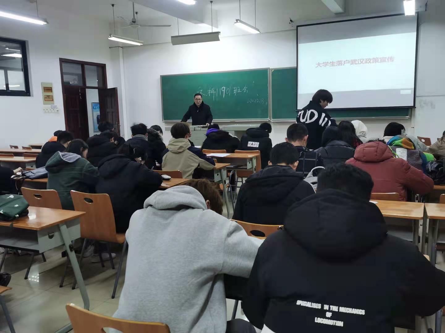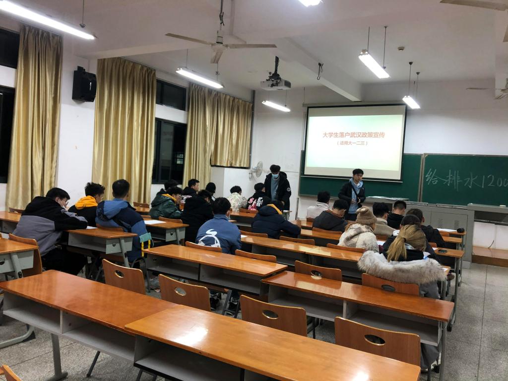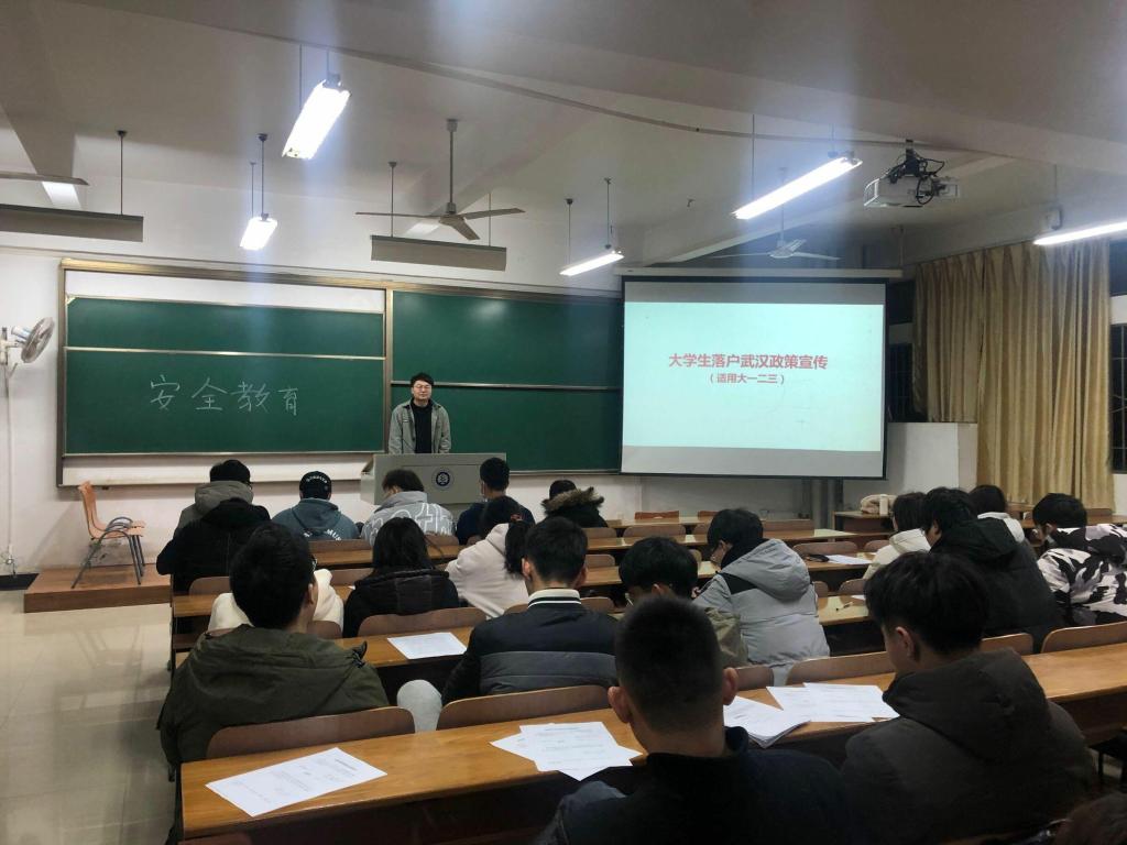 各年级于崇礼楼开展了“大学生落户武汉政策宣传”主题班会,副书记刘园美、各级辅导员、班主任及全体学生参加。
