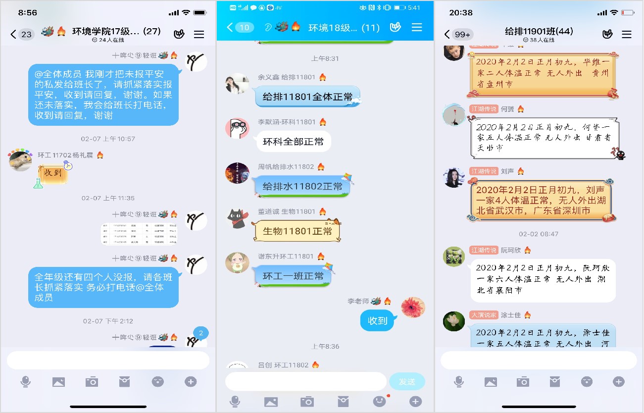 疫情就是战斗,防控就是责任。还没来得及开启“假期模式”的环境学工人,就提前进入了“战时”状态。掌握每一位学生的动向和身体状况,是我们最牵挂的事。每天不是在打电话、发短信,就是在QQ、微信上不厌其烦的询问:“某某,感冒好些了吗?”“某某,还咳嗽吗?”“大家假期尽量少出门或不出门,没有得到通知前,切勿私自返校”;学生健康“日报告”“零报告”,个别暂时联系不上的,就寻求家长帮助;身体不适学生随时跟进,直到看到学生发来信息说“全部健康”“解除疑似”等才能安心。