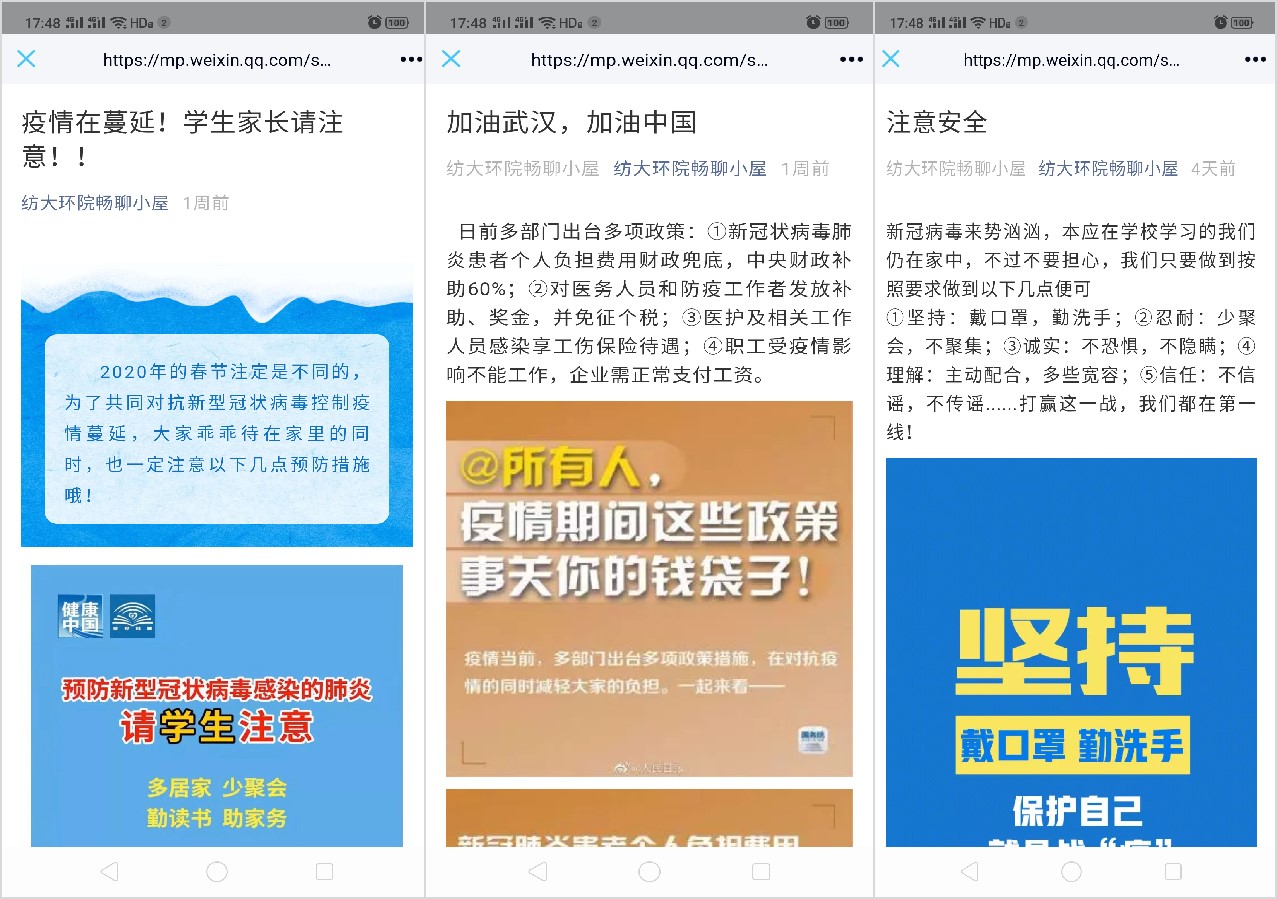 总是第一时间将《教育部致全国大学生的一封信》及省、市、学校致市民、学生等内容刊载、告知同学及家长;开办《加油中国》专栏,“有暖风在心中,春暖花开终有时”主题征稿量已达130余篇并在陆续增加,这些稿件在澳门中特网
