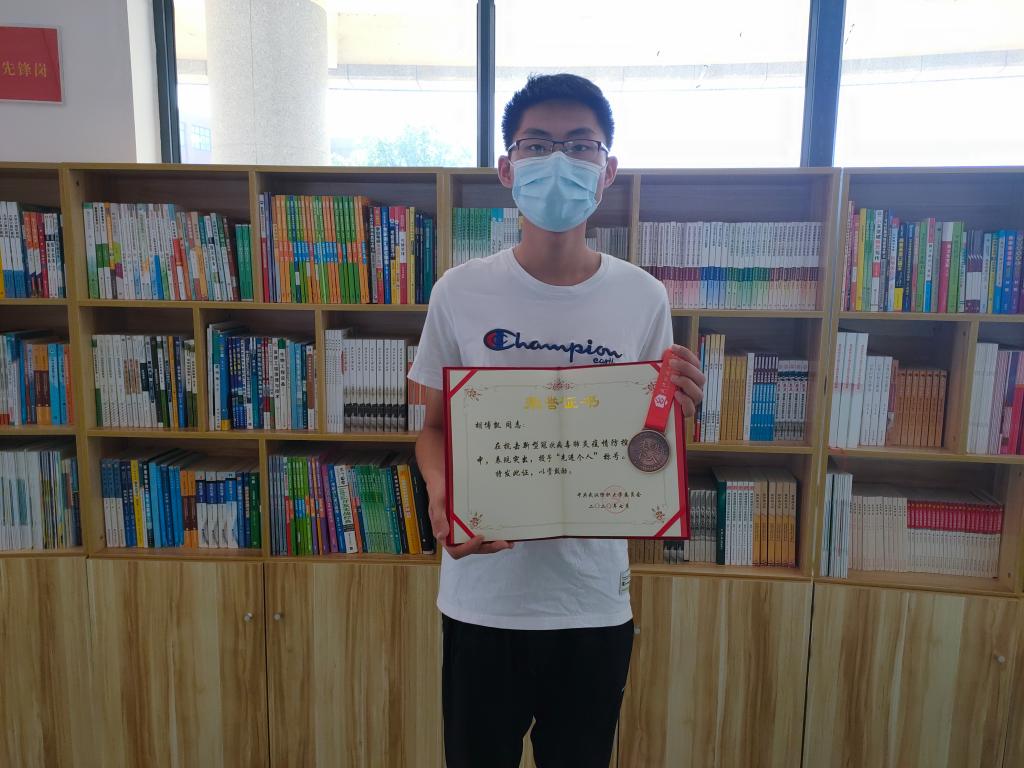 副书记刘园美将学校抗疫先进个人荣誉证书和奖章郑重转交给支部党员胡博凯。疫情期间,胡博凯积极响应号召,主动请缨成为一名志愿者,走村入户核查居民身体健康,帮助百姓解决实际困难;疫情结束后,又帮助当地企业进行全面消杀、科学防控、复工复产,赢得了居民和企业的一致认可。