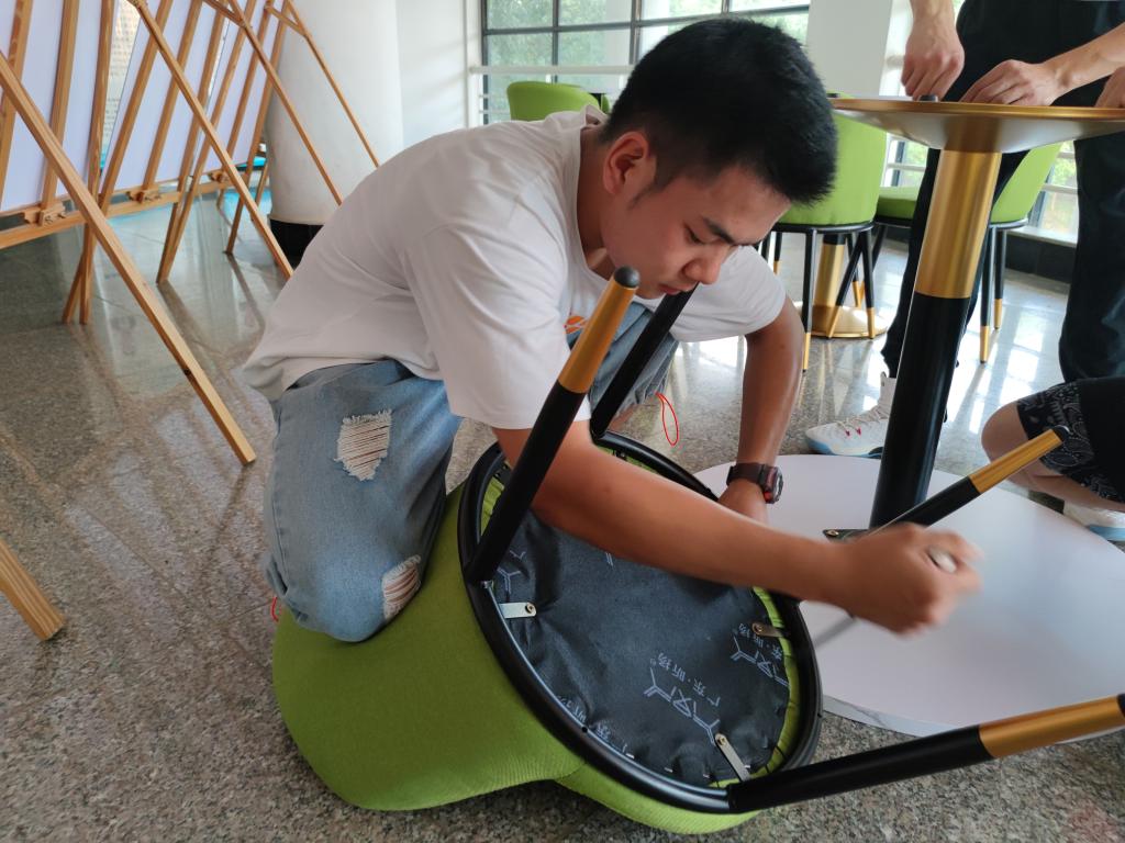 眼看太阳渐渐落山,豆大的汗珠直从马吉斌脸颊落下,来不及擦拭,他想趁天黑之前把桌椅都按装好。于是他想到了同窗好友朱滔、贾江伟,一个电话下来,不到十分钟,两人就赶到了现场。三人齐心协力、十分默契,边看安装视频边尝试安装,不到两小时就大功告成。“今日事,今日毕,这也是我们在部队养成的作风”,朱滔表示。