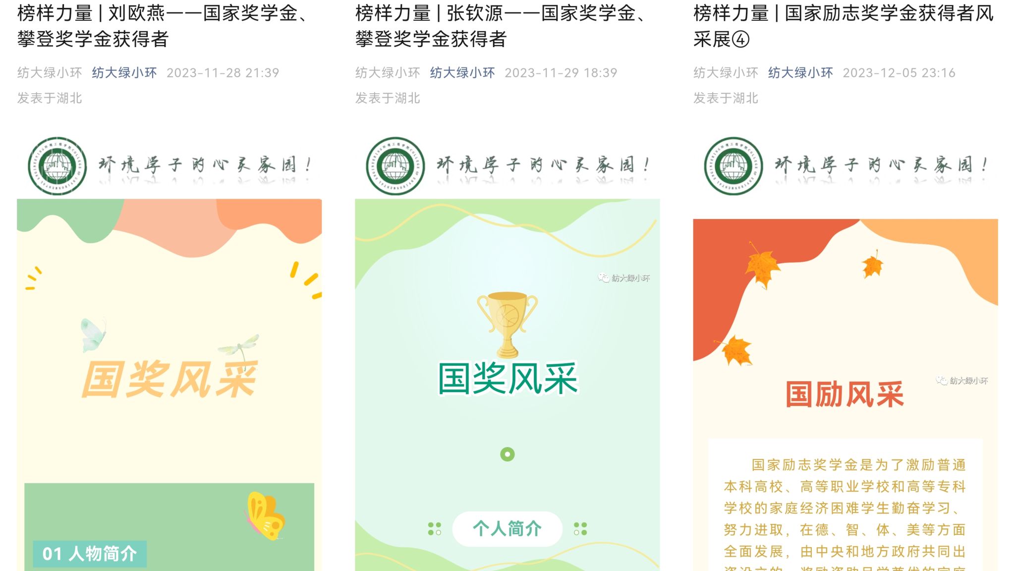 微信公众号推送国家奖学金、国家励志奖学金获得者优秀事迹,以身边的榜样激发学生活力,引导同学们刻苦钻研。