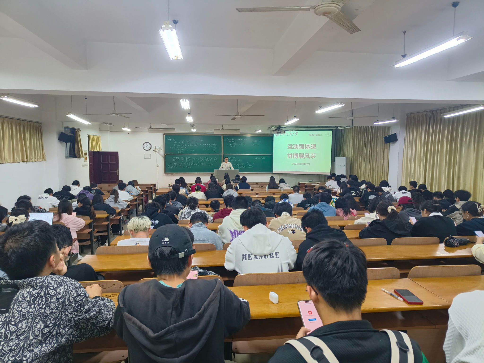 各年级及研究生分别于崇礼楼开展了“运动强体魄,拼搏展风采”主题晚点名班会。引导同学们积极开展体育活动,注意体育运动安全,发扬体育精神。