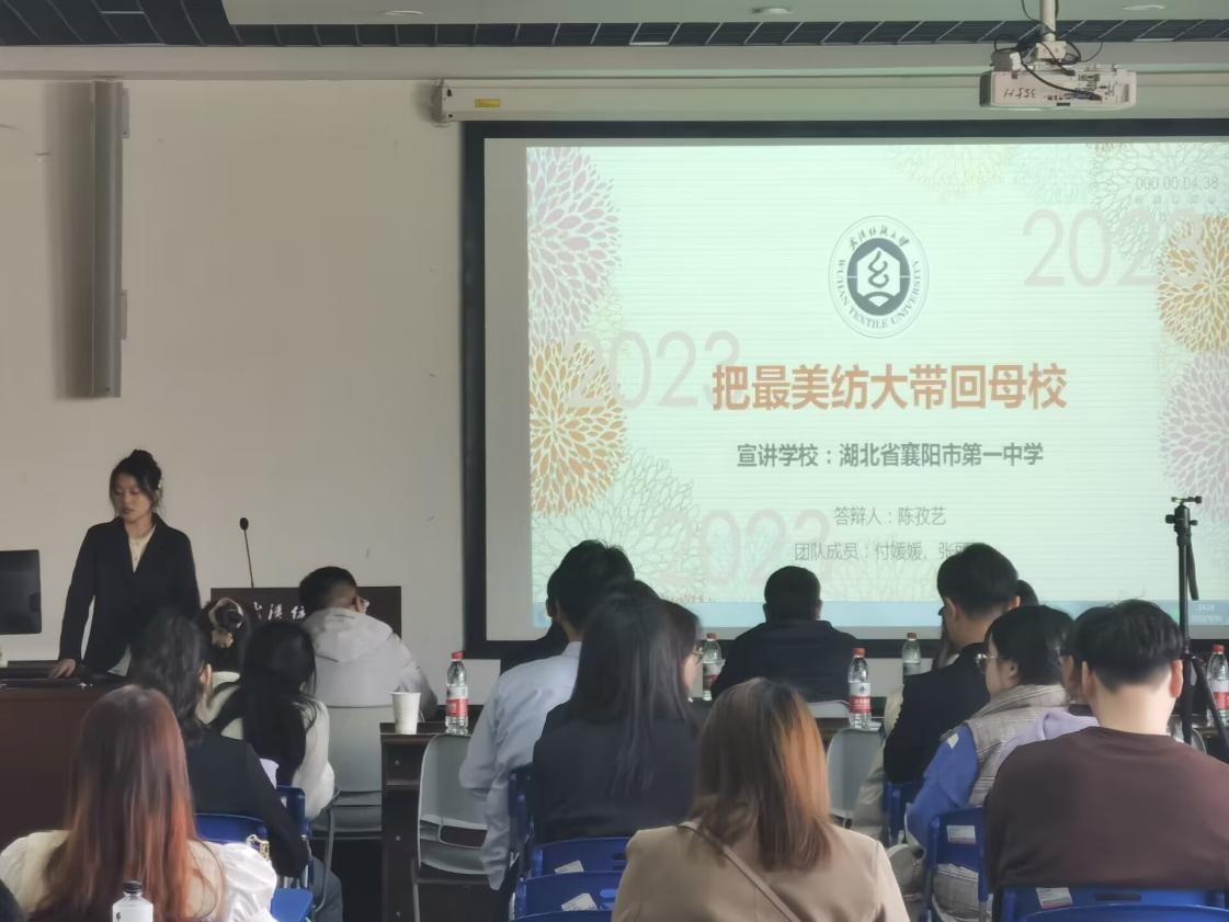 答辩会上,陈孜艺团队从实践活动前期准备、开展情况、成果展示以及团队收获等方面展开,并介绍了团队创新点。经过前期与校方的多次沟通,宣讲采用1+N的模式,一个班级线下宣讲,其他十九个班级同步直播,共计覆盖一千多名学生,让更多的同学听到“纺大故事”,传递“纺大声音”。团队成员结合自己的成长历程、通过图文并茂的方式,生动展现我校的办学实力、发展历史、发展成果、学科特色、优势学科专业、毕业生就业、校园文化等基本情况,有效地提升了学校招生宣传的广度、深度和温度。
