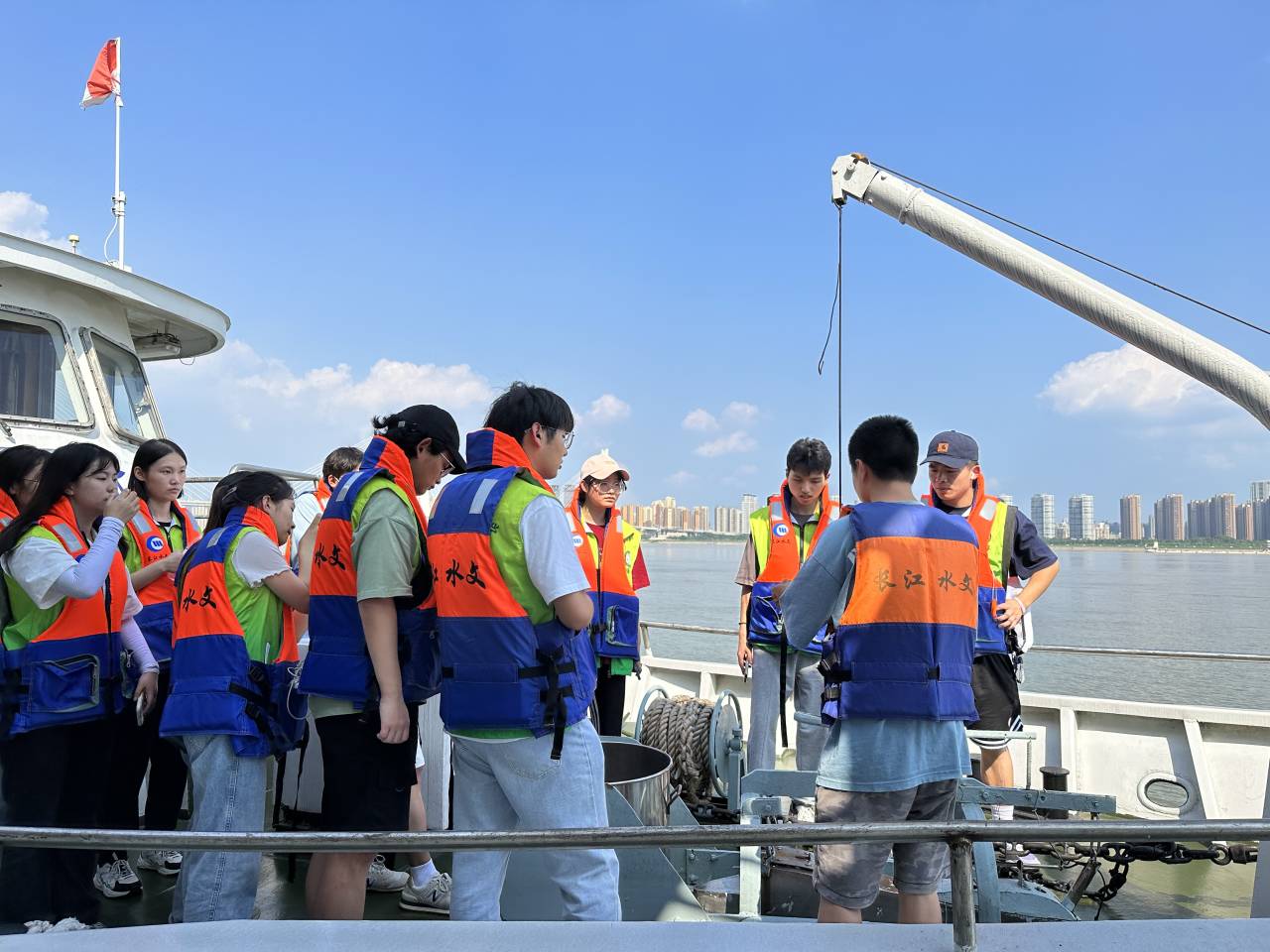 走出内场馆,实践团成员们来到汉口水文站的室外气象站和水文船上进行现场实践学习。骄阳似火,团队成员对知识的探索欲依然热情高涨。工作人员带领大家来到25米×25米标准大小的气象观测场,向队员们耐心介绍气象观测场内的各种设施与仪器。自2005年7月1日起,汉口水文站就已实现水位、雨量自动采集、自动传输和自动转发。近年来,先后采用了微机辅助测流系统、GPS定位导航,超声波回声仪测深,ADCP测流等先进仪器设备,大大提高了测洪报汛能力,水文测报技术逐步向科学化、信息化、自动化方向迈进。“科技助力护水,‘走航式ADCP’的发明对于我们水文测报如同里程碑式的发明。以前需要人工一个个点的去测,到现如今只需要一台船载“走航式ADCP”沿着河道断水面走一趟,通过对于水中沙石的声波反射进行一系列计算,即可将众多数据反馈到显示屏,以此对各种水文现象做到准确地观测预报。”讲解人员介绍到。