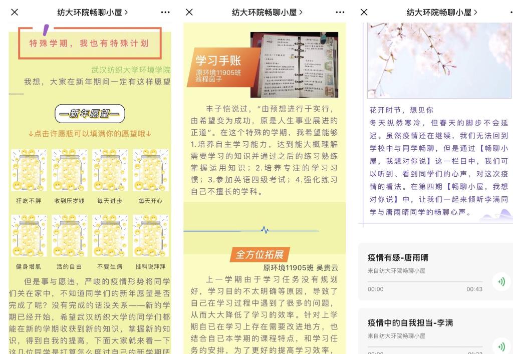 疫情期间,心理二级站围绕3.25心理健康日开展了居家抗疫“五大特色活动”,一是“畅聊小屋,我想对你说”,通过配乐朗诵的方式将疫情期间自己的感想、学习心得等向小屋分享,打造“云树洞”,同学们纷纷表达了对 “舍小家为大家”的一线人员的敬佩和感激;二是“特殊学习计划”征集,各年级同学根据不同的学习要求制定疫情期间的学习计划,规划好居家学习生活;三是《有暖风在心中,春暖花开终有时》抗疫征文,用自己的视角讲述身边人英勇抗“疫”的事迹;四是“居家抗疫读书会”,鼓励学生从书籍中汲取力量,分享读书心得;五是关爱困难学生“捐流量”活动,助力环境学子安心上网课。