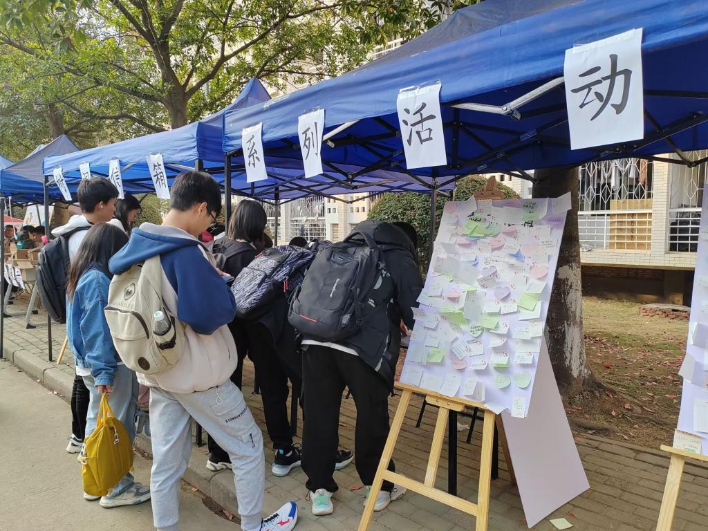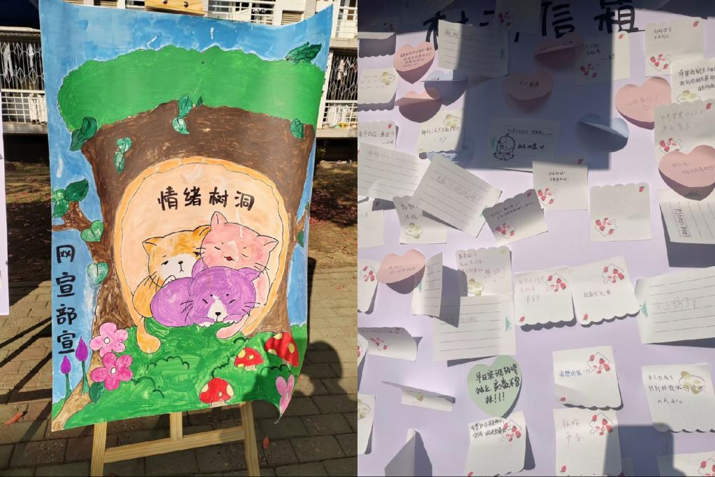 心理二级站举办的“树洞信箱”活动在一食堂侧门开展。活动通过匿名书写、动手折叠等方式,引导同学们学会倾诉和求助,做自己心理健康的第一责任人。
