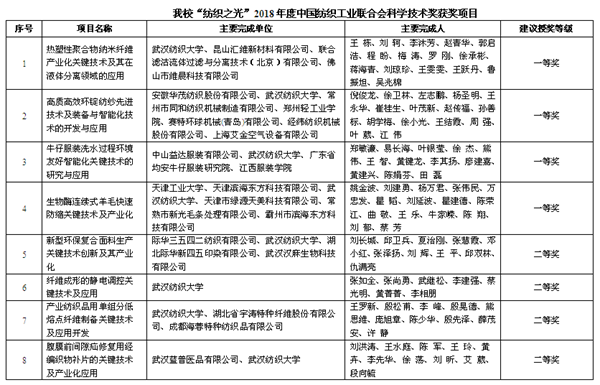 王栋科研团队与昆山汇维新材料有限公司等合作完成的“热塑性聚合物纳米纤维产业化关键技术及其在液体分离领域的应用”项目、徐卫林科研团队与安徽华茂纺织股份有限公司等合作完成的“高质高效环锭纺纱先进技术及装备与智能化技术的开发与应用”项目、易长海科研团队与中山益达服装有限公司等合作完成的“牛仔服装洗水过程环境友好智能化关键技术的研究与应用”项目、姚金波科研团队与天津工业大学等合作完成的“生物酶连续式羊毛快速防缩关键技术及产业化”项目获一等奖。王罗新、张如全、刘洪涛、夏治刚科研团队的项目获二等奖。另外我校权衡教授的专利“含侧长链烷基的改性聚氨酯柔性高分子乳液的制备方法及其产品”在本届专利奖评选中获得优秀奖。