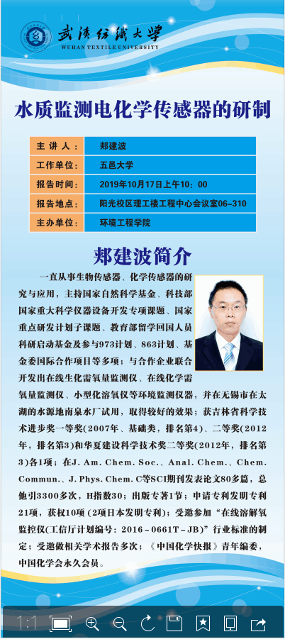 10月17日,五邑大学郏建波教授来院作了《水质监测电化学传感器的研制》讲座,相关专业老师、研究生和本科生到场聆听。