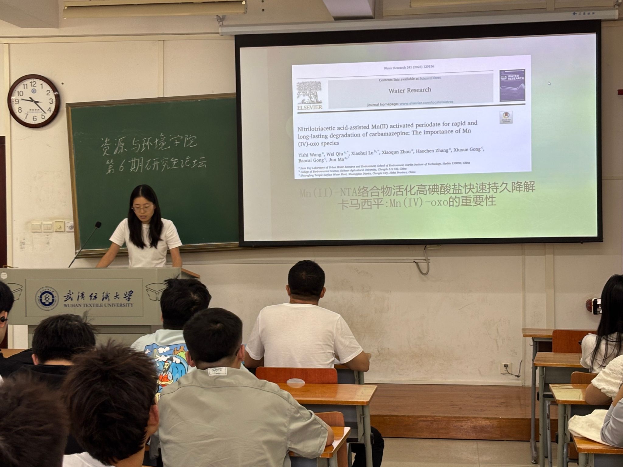 刘晓涵同学分享的文献构建了Mn(II)//NTA/PI体系,实现了卡马西平的高效快速降解。研究发现,主要活性物种为NTA稳定的Mn(IV)-oxo,通过单电子氧原子转移路径选择性氧化富电子污染物,而不是自由基路径。体系在宽pH范围和实际水体中均表现优异,且高碘酸被完全转化为无毒的碘酸盐,避免了有毒碘副产物的生成,为水中微量有机污染物的高效去除提供了新策略。