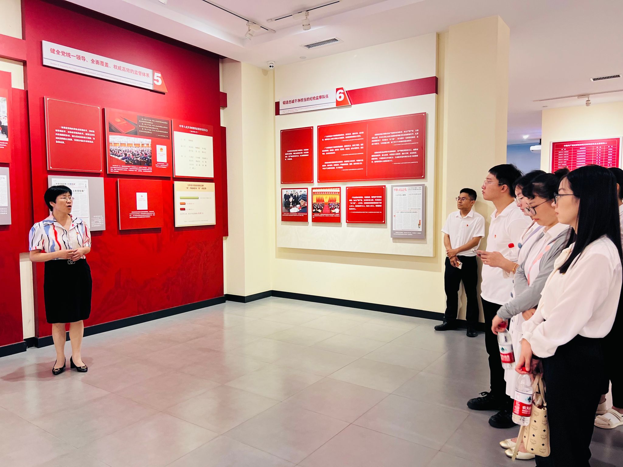 陈列馆内,师生党员面向党旗,举起右拳,重温入党誓词。跟随中国共产党纪律建设历史陈列馆讲解员的脚步,全体师生党员依次参观了“创立与探索”、“推进与曲折”、“恢复与发展”、“新时代新征程”四个主题展览馆,详细了解党纪建设历史,从中国共产党探索党纪建设道路的艰难历程、反腐倡廉工作的光辉历程和重大成就中汲取奋进的力量和智慧。一张张泛黄的照片、一件件珍贵文物和一个个重大历史事件,全面回顾了党的纪律建设历程,让参与本次专题实践的师生党员们对党的纪律建设有了更加深刻的认识。